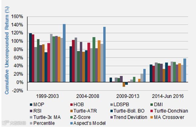 图4:1999年1月至2016年6月期间的趋势跟踪模型和平均值的模拟表现