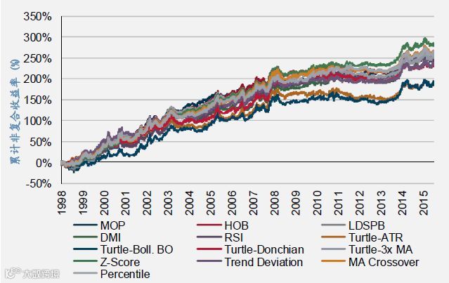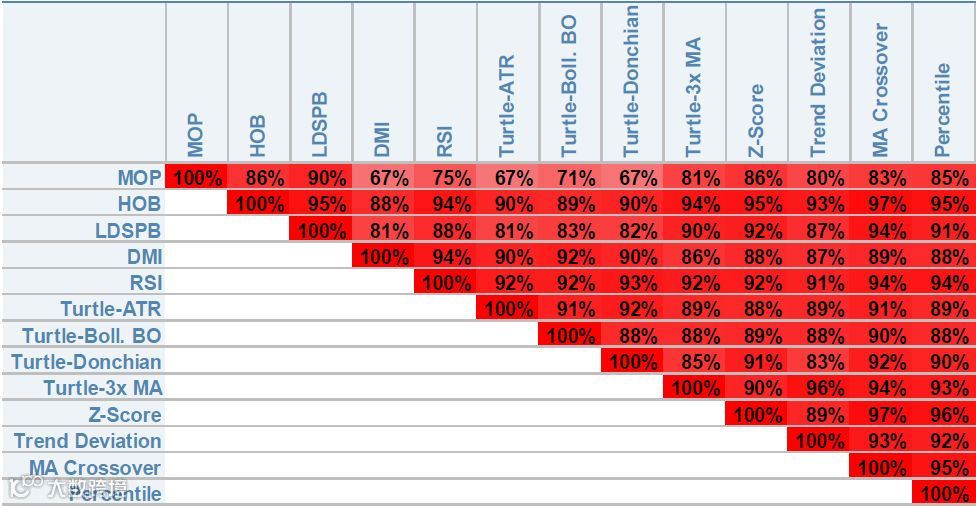 尽管我们介绍的13种模型代表了系统捕获中期趋势的各种不同方法,但是不难发现它们之间的相关性非常高。图3展示了1999年1月至2016年6月这13个模型之间的相关性,可以看到最低的相关性也达到了67%(MOP与Turtle-ATR之间),平均相关性达高达89%。