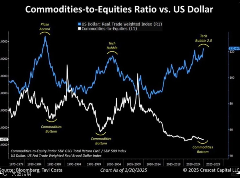 每当美元达到峰值和商品与股票比率触底时,一个新的周期就会开始。现在,我们正处在另一个历史分歧中。美元仍然在高位,而大宗商品价格接近几十年来的相对低点。专注于大宗商品(如黄金、白银)市场动态分析的分析师Gray Tanashian指出:黄金是商品的“先锋”,黄金的上涨是大宗商品全面上涨的前奏。