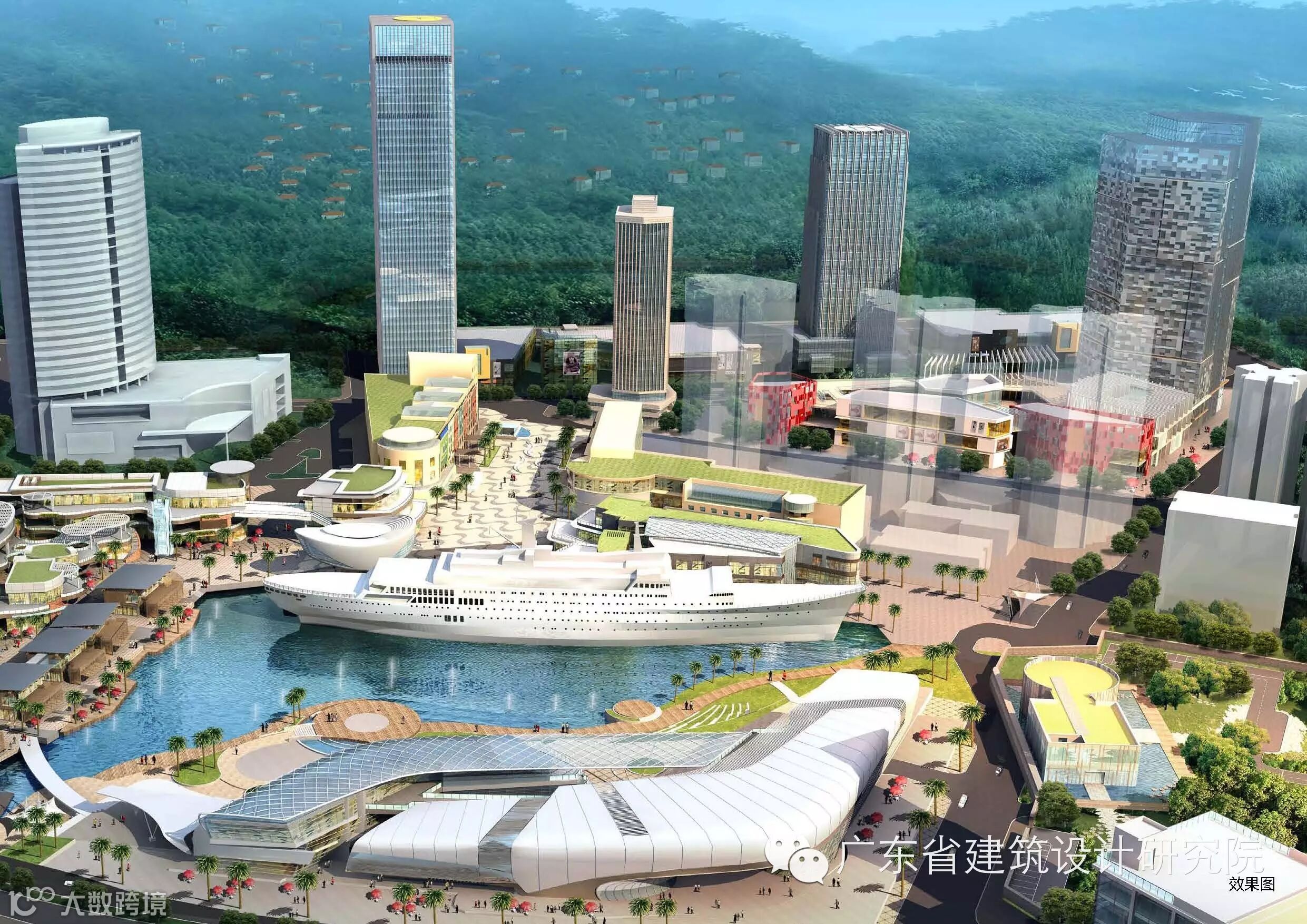 各栋建筑围绕“明华轮”及中央湖面为景观视线焦点布局,利用各组建筑屋面、露台构建成层叠退台的步行休闲系统。