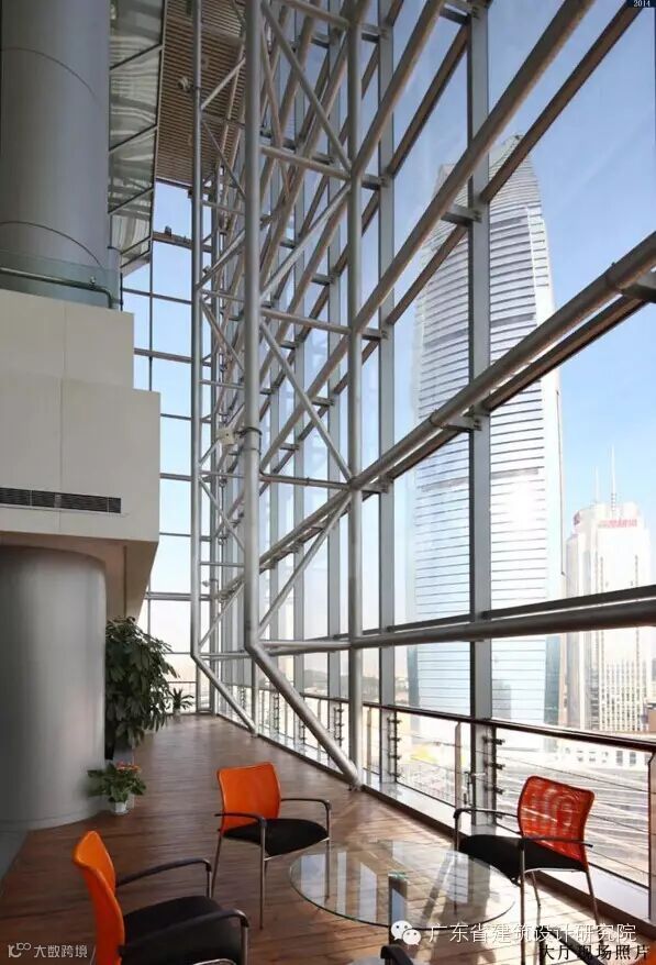 办公标准平面方正严谨,布局紧凑而不失舒适性,合理的进深安排与四面采光的特性更显其开放性与人性化,为办公提供了多种布局方案实施的充分平台。通过具有通透性的共享空间,多种绿化层次的中庭产生多层次的视觉交流,及对建筑物的分段,构成通道状的间隙空间,尤其是具有较高共享性的开放空间群,在表现城市性方面,显示其包容的能力。