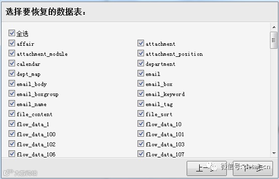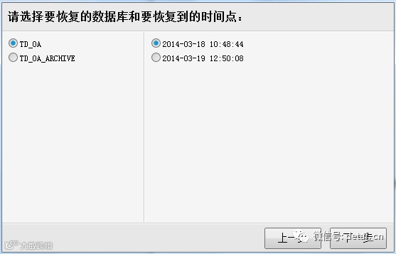 此热备份数据恢复方法不需要停止OA服务。打开OA安装目录下的bin目录,找到TDRecovery.exe,双击运行,直接点击下一步,选择数据库备份文件所在的目录,再选择要恢复的数据库和要恢复到的时间点,随后确认要恢复的数据表,点击下一步直到数据恢复完成即可(以上操作会覆盖恢复的数据表的现有数据,操作需谨慎)。如图所示: