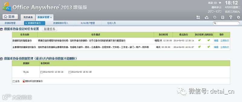 2)方法二:以admin身份登录OA系统,在系统管理->数据库管理->数据库热备份页面,通过数据库热备份定时任务设置自动热备份数据库,设置好数据库定时智能备份的参数(备份间隔天数、备份时间、备份的数据库、重点模块数据等),系统根据定时智能备份参数进行自动定时热备份数据库,将数据库备份到OA安装目录下的bak目录下(如OA安装在d:\myoa下,则数据库备份到d:\myoa\bak目录)。 如需即时备份,可直接点击“立即执行”即可立即启动备份程序进行数据库热备份。如图所示: