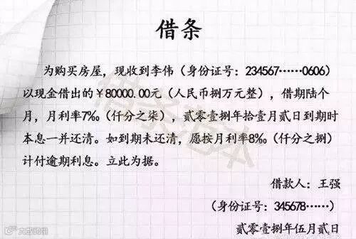 三、要写明借款人姓名全名,且应与身份证上的名字一致。借款人姓名后应附身份证号码,如此可避免就借款人身份产生争议。