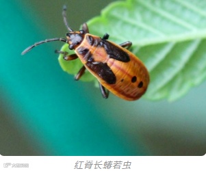 成虫体长10~16毫米,体茶褐色,具有褐色刻点;前胸背板前缘具有4个黄褐色横列的斑点,小盾片基部具有5个成黄褐色横列的斑点。