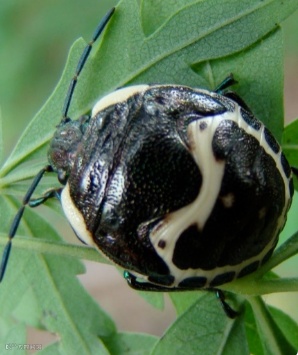 成虫体长13~16毫米,宽9~11毫米,宽椭圆形,金绿色或蓝紫色,有金属光泽,成虫前胸背板有横向近“日”字型赭红色纹,小盾片隆起如龟背,前缘“ㄇ”字型、端部边缘、中部2条横波纹以及中央1条短纵纹均为赭红色。老熟若虫头、胸黑色,腹背有一个“凹”字型黑斑,侧接缘有一列圆形黑斑。