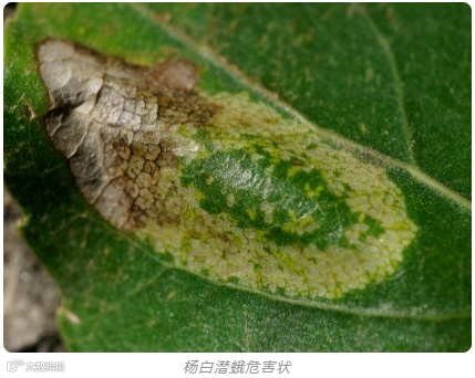 成虫体长3毫米,银白色,前翅臀角有黑色近三角形斑纹1个,后翅缘毛极长,呈“羽”状。幼虫体长约5毫米,黄白色。茧白色,丝质,枣核状,两端各伸出丝带2条,附着在树叶、树干或建筑物上。