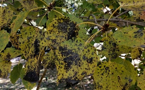 一般发生在叶片及嫩梢上,以危害叶片为主,发病初期首先在叶背面出现针状凹陷发亮的小点,后病斑扩大到1毫米左右,黑色,略隆起,叶正面也随之出现褐色斑点,5~6天后病斑(叶正、反面)中央出现乳白色突起的小点,即病原菌的分生孢子堆,以后病斑扩大连成大斑,多呈圆形,发病严重时,整个叶片变成黑色,病叶可提早2个月脱落,严重影响树木正常生长,若连年受害,则引起树势衰弱,为溃疡病和腐烂病等次期性病害的发生创造条件。北京地区该病菌以菌丝体在落叶或枝梢的病斑中越冬,翌年5-6月间病菌新产生的分生孢子借风力传播,落在叶片上,芽管直接穿透表皮侵入或由气孔、伤口侵入。6~7月若高温多雨、地势低洼、种植密度过大,发病最为严重;7~8月高温季节停止发病,9月以后再度发病,直至落叶。雨水多发病重,雨水少则发病轻。