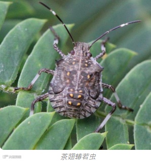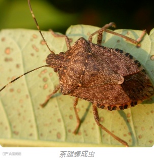 茶翅蝽又名臭木椿象、茶翅臭象,俗称臭大姐。寄主主要有榆、国槐、臭椿、合欢、桑、丁香、海棠、樱花、苹果、桃、梨、柿树和樱桃等。以成虫、若虫刺吸果实、嫩梢危害为主;受害果实畸形,形成“疙瘩果”,受害枝梢被害处流胶。具有在多种寄主植物间转移危害的习性。