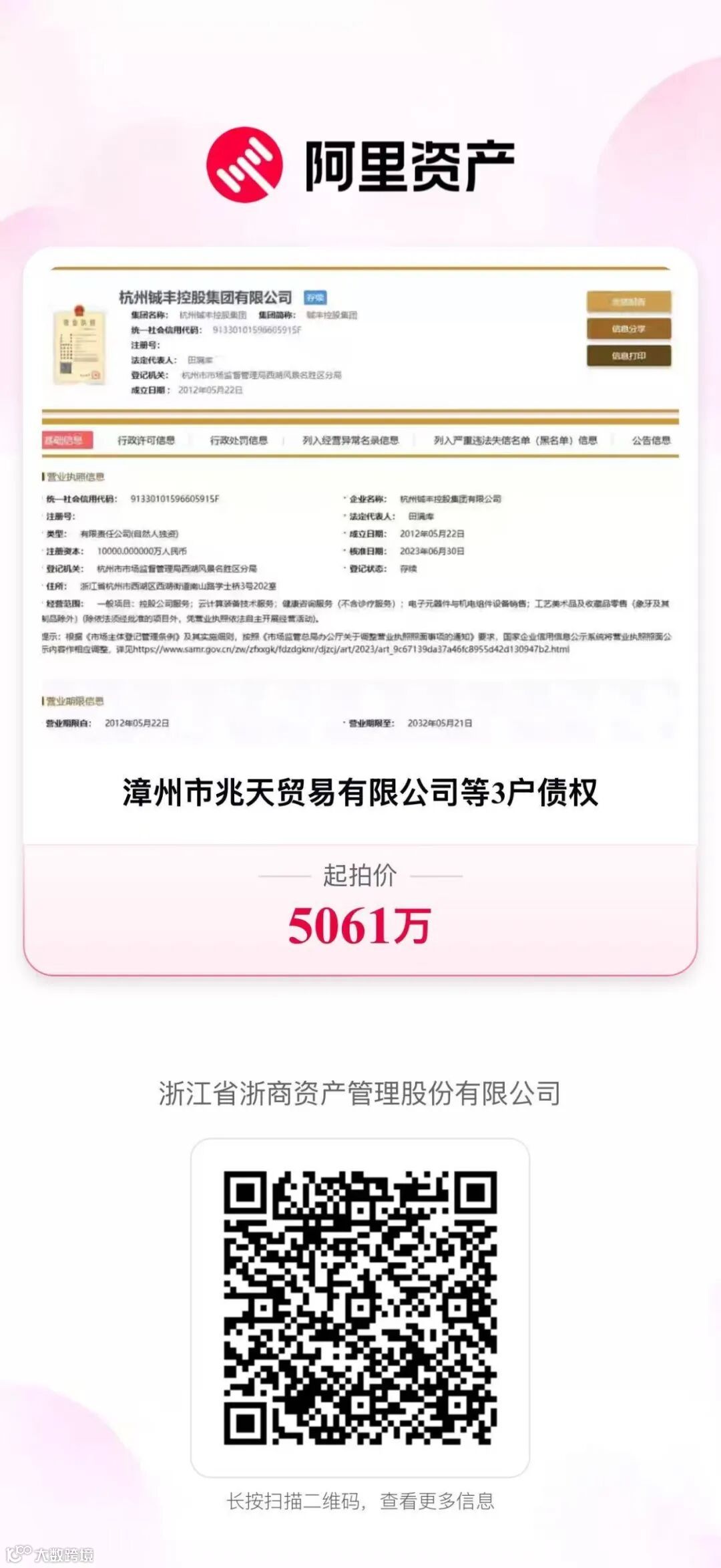 浙江省浙商资产管理股份有限公司将于【2025】年【12】月【24】日10时至【2025】年【12】月【25】日10时止(延时的除外)在淘宝网资产竞价网络平台上(https://zc-paimai.taobao.com/)进行公开竞价活动,可识别下图查看详情。
