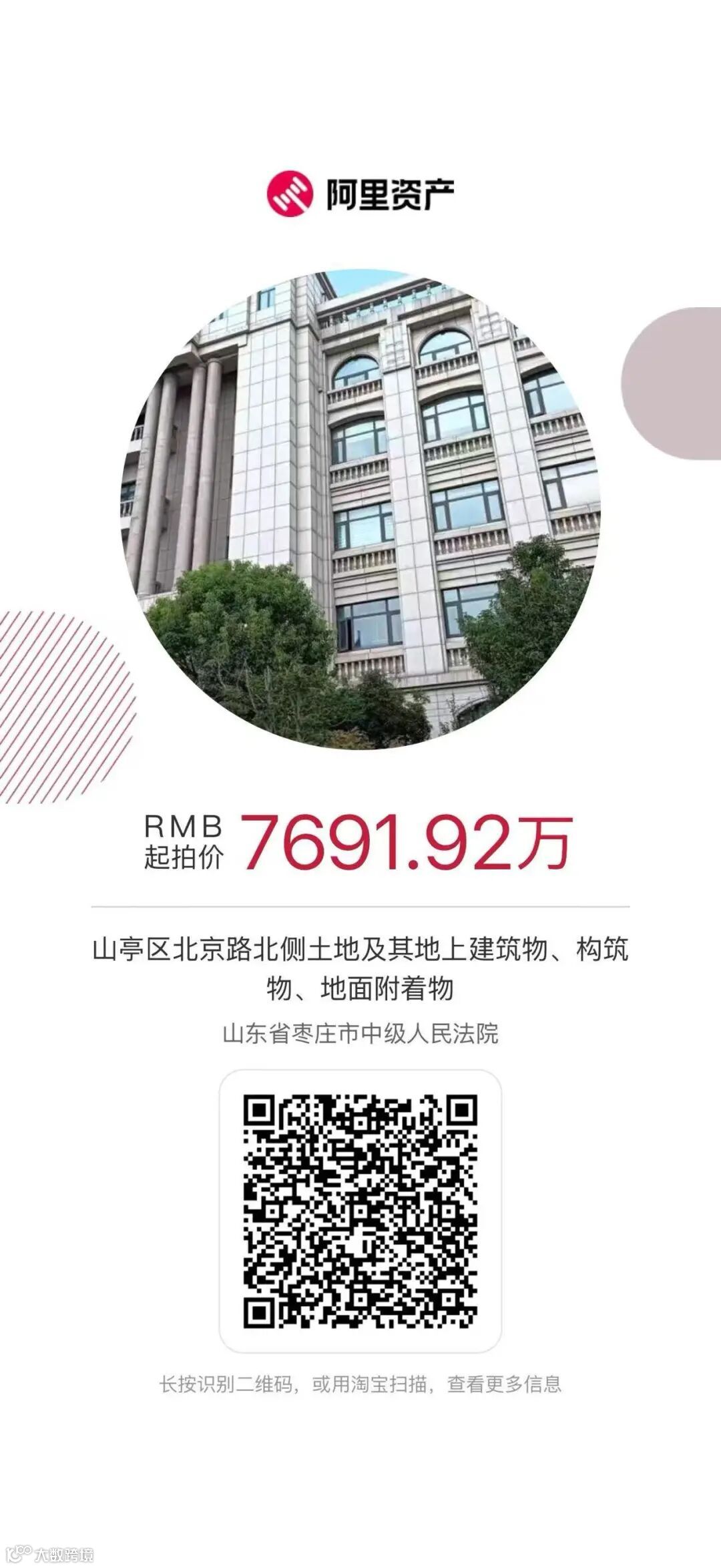 山东省枣庄市中级人民法院将于2025年10月9日10时至2025年10月10日10时止(延时的除外)在山东省枣庄市中级人民法院淘宝网司法拍卖网络平台上(网址:https://sf.taobao.com/0632/03?spm=a213w.3065169.courtList.2733.RKulx8;户名:山东省枣庄市中级人民法院)进行公开拍卖活动,可识别下图查看详情。