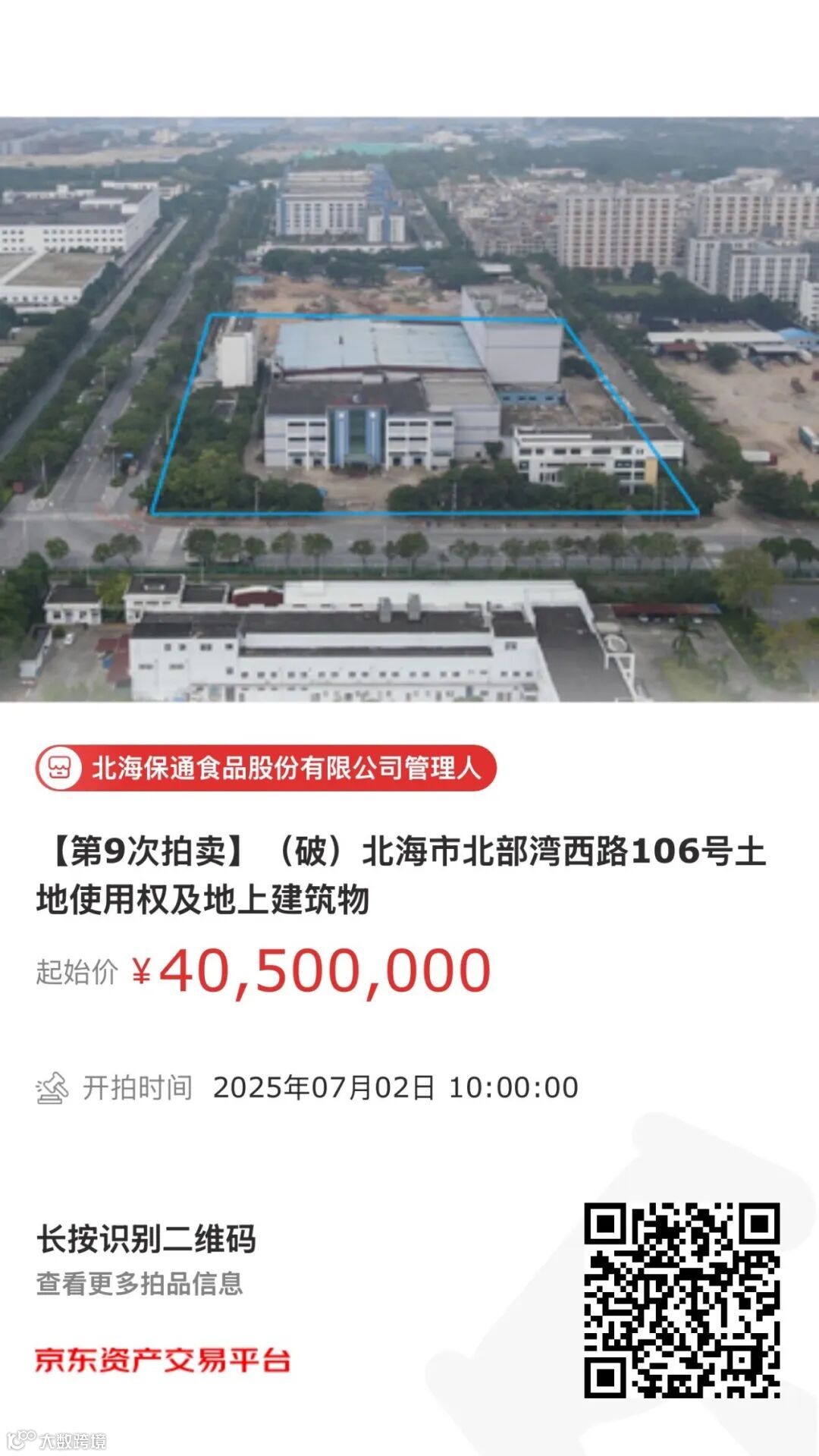 北海保通食品股份有限公司管理人将于2025年7月2日10时起至2025年7月3日10时止(延时除外)在京东资产交易平台(处置单位:北海保通食品股份有限公司管理人,监督单位:北海市中级人民法院,拍卖网址:https://auction.jd.com/bankrupt.html)对北海保通食品股份有限公司名下位于北海市北部湾西路106号土地使用权及地上建筑物进行公开拍卖活动,可识别下图查看详情。