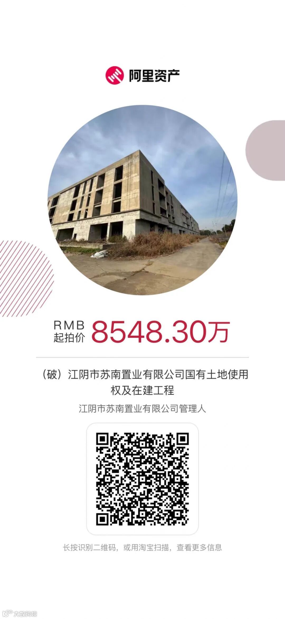浙江省浙商资产管理股份有限公司所持有的江阴市苏南塑化交易市场有限公司、江阴市南德塑业有限公司等两户债权项下抵押物江阴市徐霞客镇璜塘外环西路2、8号的国有土地使用权及在建工程,将于【2025】年【4】月【12】日10时至【2025】年【4】月【13】日10时止(延时的除外)在阿里资产平台上公开竞价活动,可保存下图,识别查看详情。