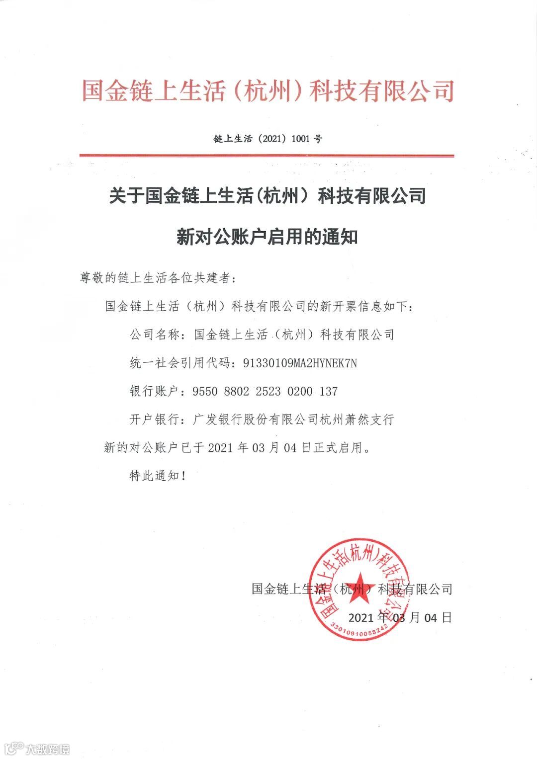 关于国金链上生活(杭州)科技有限公司新对公账户启用的通知