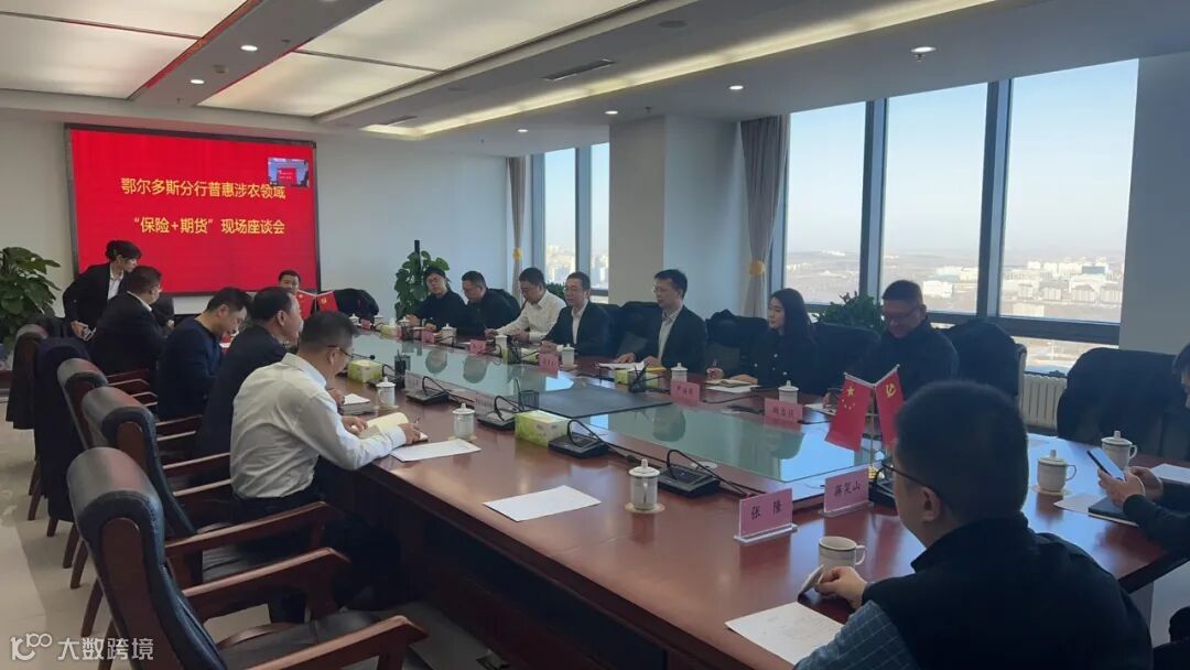 27日,活动一行人员来到鄂尔多斯分行,就银、期、企合作进行交流。鄂尔多斯分行副行长马志华介绍了鄂尔多斯的当地的宏观经济情况。鄂尔多斯分行副书记李楠介绍了当地的银行服务农业合作社等普惠金融开展情况,并提出了具体期保业务需求,现场探讨了当地玉米种植产业的“政府+保险+银行+订单”模式。此外,本次调研同时进行了银行与期货客户服务合作的交流,双方均表示期待未来以更多服务模式在企业风险管理、期保业务、乡村振兴等方面加强合作,共同做好普惠金融大文章。