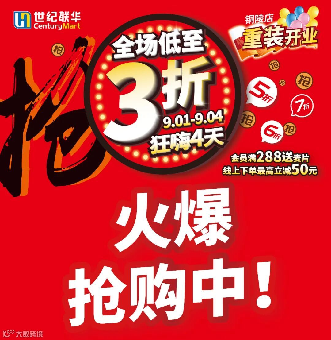 导读:世纪联华铜陵店9月1日重装开幕!全场低至3折啦!超嗨爆款!超豪满送!超多满减!go~go~go~