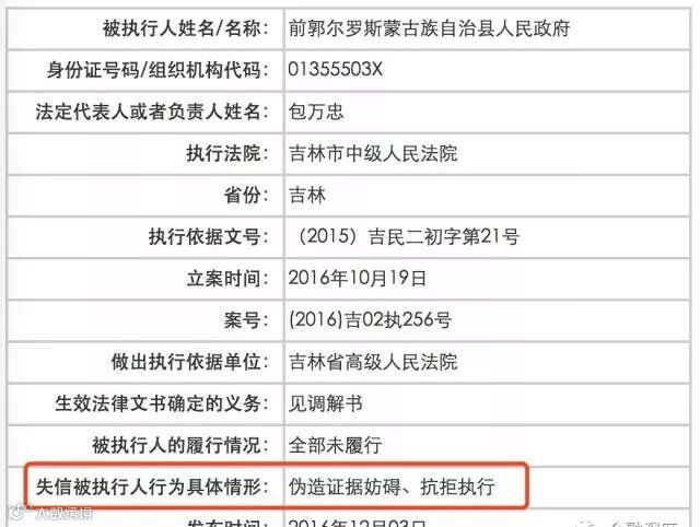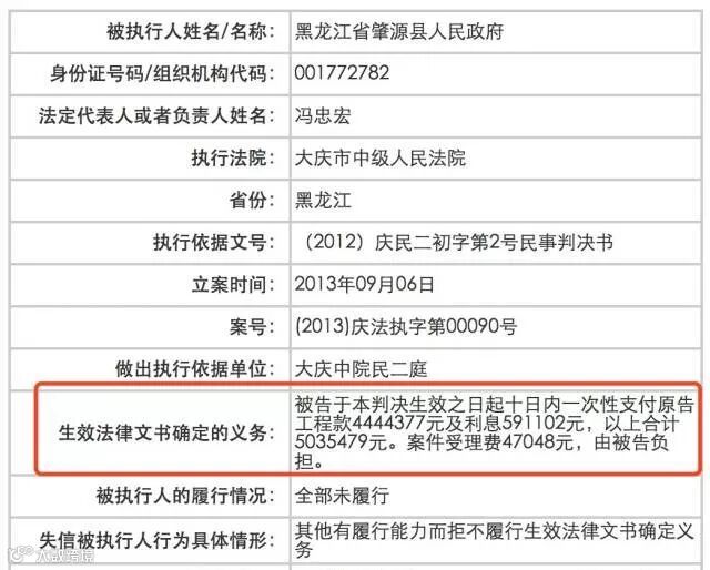 不单单是大庆市政府列入了老赖名单,就连其下面的县肇源县也在老赖名单中。