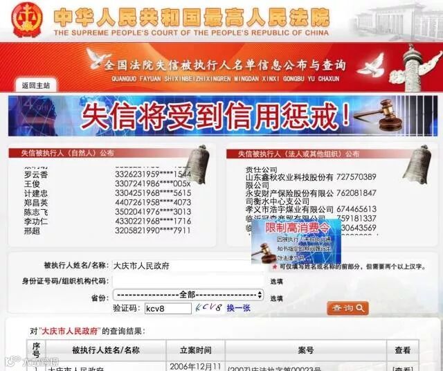为了防止是因为系统的问题,小编特地在最高人民法院的失信人名单中反复查询,发现确实大庆市人民政府在老赖的名单内。
