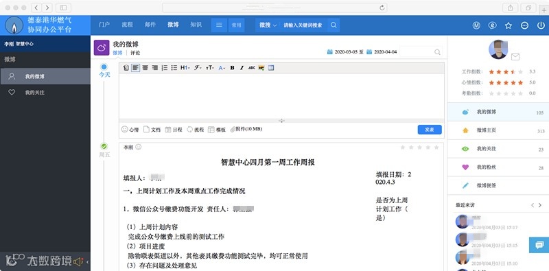 工作微博是燃气公司OA系统内的子系统,其形式类似于新浪微博,但发布范围仅限于公司系统内部发布工作相关内容,起到了既可开展工作交流又可严守业务机密的作用。智慧中心利用工作微博系统的模版功能,建立了工作周报的填写模版,要求各部门按照模版对上周工作计划落实情况、本周工作进度、下周工作计划及重点工作每周定时进行汇报。