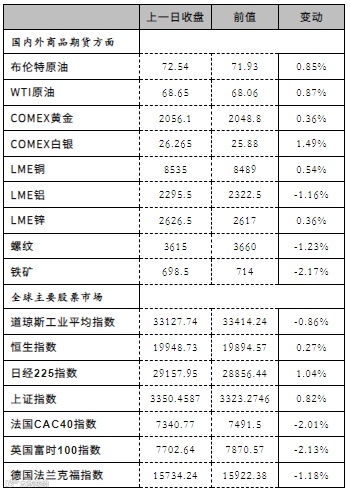 5.市场情况:Brent主力收于72.5美元/桶,前收73.72美元/桶,WTI主力69美元/桶,前收70.03美元/桶。Oman主力收于72.39美元/桶,前收73.43美元/桶,SC主力收于491.5元/桶,前收531.7元/桶。
