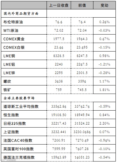 5.市场情况:Brent主力收于76.71美元/桶,前收76.11美元/桶,WTI主力72.15美元/桶,前收71.74美元/桶。Oman主力收于75.89美元/桶,前收74.01美元/桶,SC主力收于526.5元/桶,前收524.1元/桶。