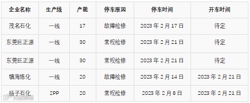 装置方面:山西晋煤天源年产10万吨甲醇装置计划于2月25日停车检修,暂定为期一个月。陕西黄陵年产30万吨甲醇装置20日停车检修,预计为期一周左右。河南鹤煤煤化年产60万吨甲醇装置于11.12日因成本问题停车,计划于近期重启。新疆新业年产50万吨甲醇装置正常,开工一般,在六七成附近;该企业计划2月17日起停车检修几日,预计19-20日左右恢复。宁波富德其60万吨/年DMTO装置稳定运行,有计划中下旬停车检修