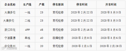 装置方面:山西孝义市骏捷新材料年产25万吨甲醇装置于2月28日停车检修,暂定为期三天。陕西黄陵年产30万吨甲醇装置27日已陆续恢复。山西晋煤天源年产10万吨甲醇装置目前运行平稳,原定检修计划暂时取消。河南鹤煤煤化年产60万吨甲醇装置2022年11月12日因成本问题停车,2023年2月21日点火,装置于2023年2月27日已产出产品。内蒙古荣信二期90万吨装置计划3月15日起停车检修,预计为期25天。
