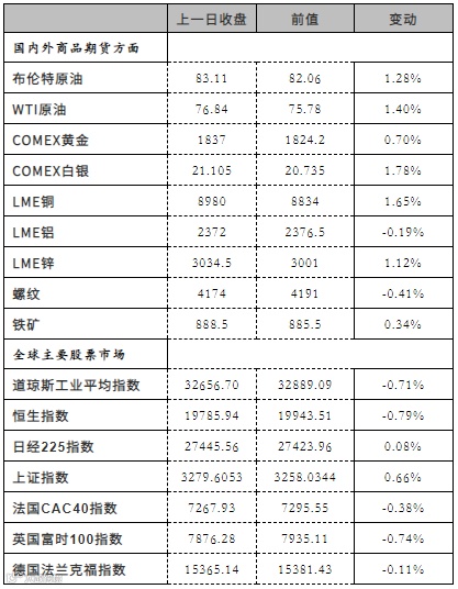 5.市场情况:Brent主力收于82.45美元/桶,前收83.23美元/桶,WTI主力75.68美元/桶,前收76.45美元/桶。Oman主力收于81.39美元/桶,前收82.28美元/桶,SC主力收于542.7元/桶,前收551.8元/桶。