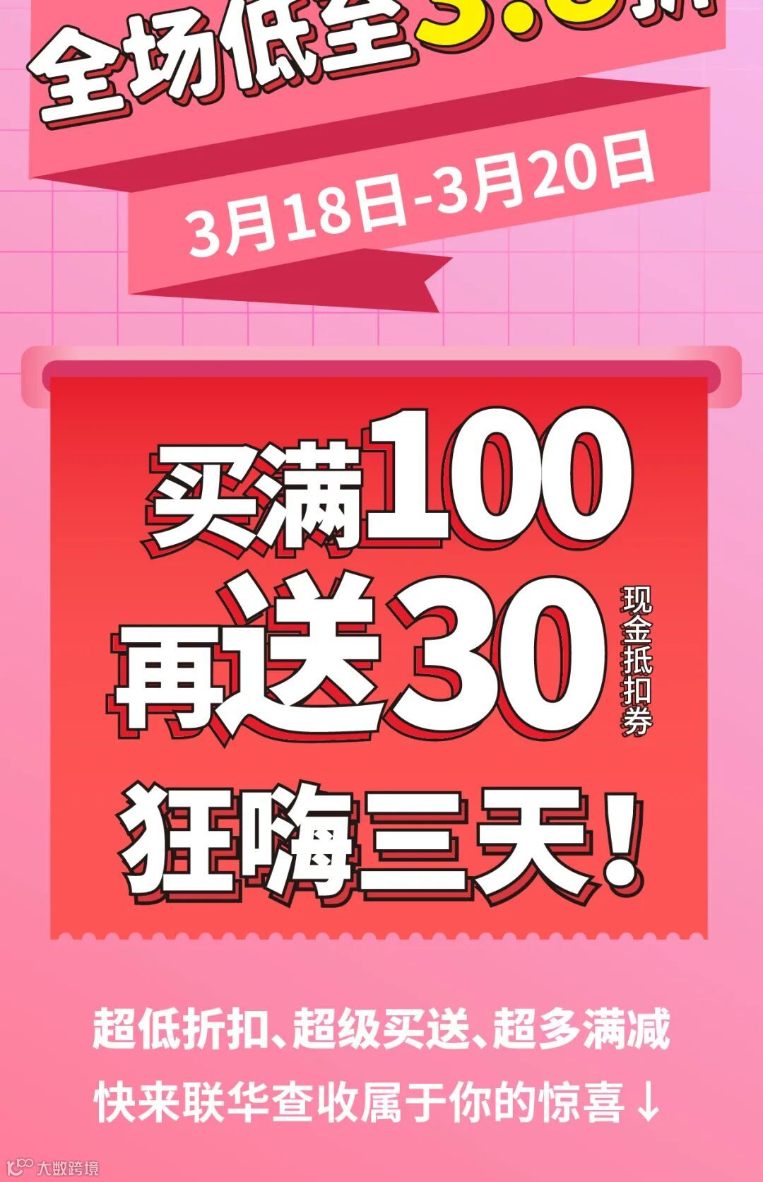 导读:世纪联华3.18-3.20春季大促全场低至3.8折,满100再送30!