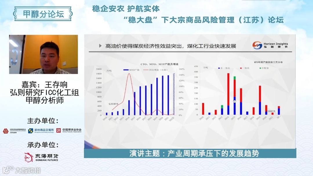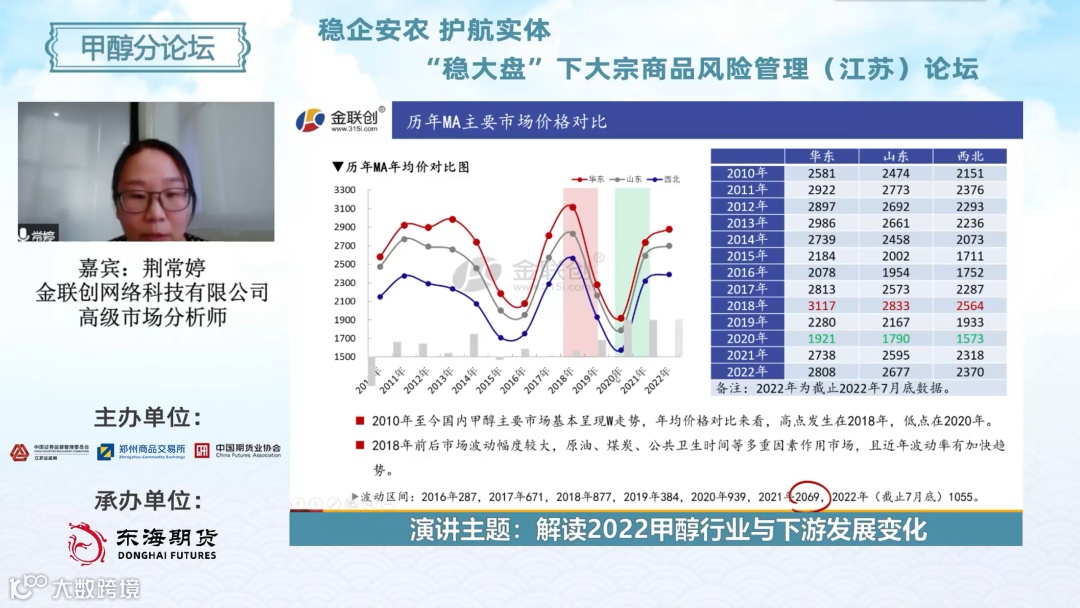 为助力稳住经济大盘,帮助产业企业纾困解难,推动复工达产,2022年8月3日,由江苏证监局、郑州商品交易所、中国期货业协会共同主办,东海期货有限责任公司承办的 “稳企安农 护航实体”—“稳大盘”下,大宗商品风险管理(江苏)论坛之甲醇分论坛成功举办。东海期货有限责任公司副总经理靳国奇出席并发表致辞,弘则研究FICC宏观分析师姚昕泽、弘则研究FICC化工组甲醇分析师王存响、金联创网络科技有限公司高级市场分析师荆常婷、东海资本管理有限公司衍生品部产品经理孟玥等嘉宾参会并作主题分享。本次活动共吸引产业客户、机构及个人投资者等约两千人次线上参会。