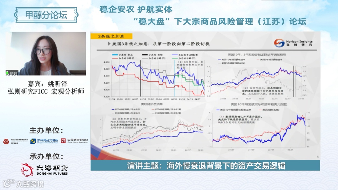 主题演讲环节,弘则研究FICC宏观分析师姚昕泽首先带来题为《海外慢衰退背景下的资产交易逻辑》的分享。她认为在海外方面,美联储这一轮缩表较上一轮规模更大、过渡期更短,但市场冲击有限。美国加息强度和节奏将左右全球经济衰退预期的定价,在美国经济衰退的基准预期下,铜价的下跌仍未到位;美国经济实质衰退前,油价仍受季节旺季需求和需偏紧预期的支撑;而经济开始衰退后,原油受到基本面走弱导致的需求回落和季节性旺季结束的拖累,仍会跟随下行。人民币的走势取决于出口和美联储加息,而从全球制造业供需关系看,供需缺口开始转负,商品价格进入下行周期。国内地产方面,6月商品房成交面积反弹,房企资金链修复刚刚开始。但政策利好很难带动市场情绪,核心矛盾仍然是开发商信用问题。基建投资增速也在上行区间,但只起到锦上添花作用。