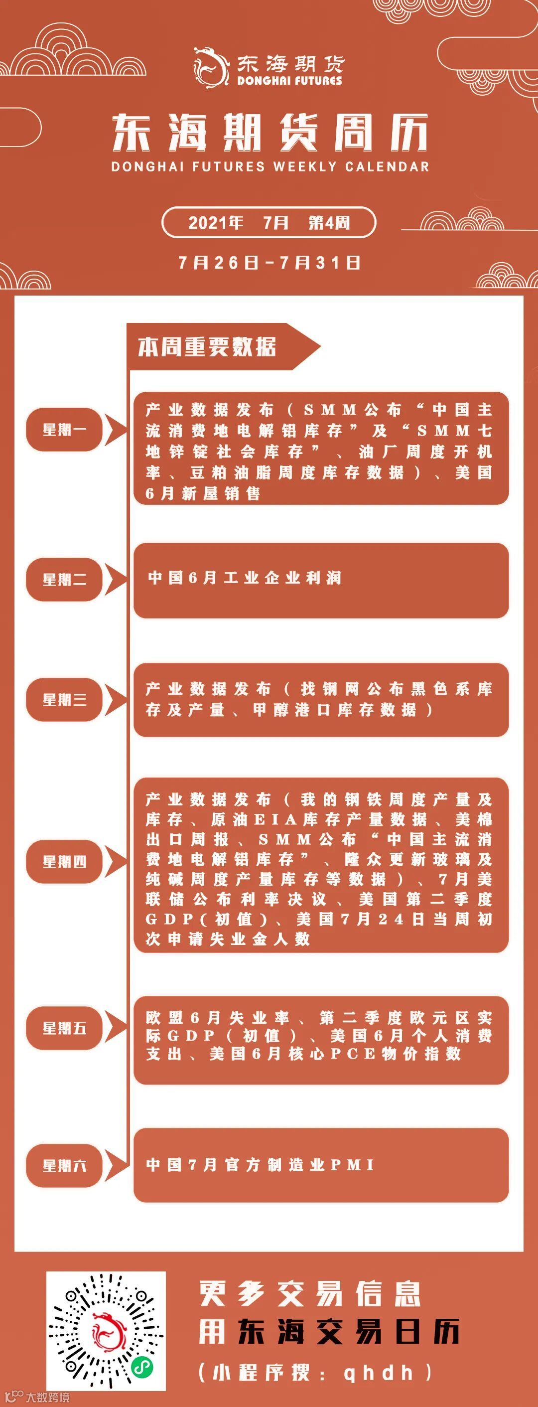 东海期市周历丨本周你需要知道的重要数据(7月26日-7月31日)