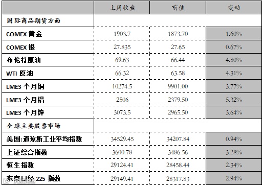 在海外方面,上周拜登提出上任后一份规模高达6万亿美元的预算案,刺激大宗商品价格上涨。但长期来看,4月全球M2增速见顶,关注6月10日欧央行利率决议和6月17日美联储利率决议。美国需求恢复或将边际放缓,市场对需求端充分定价,短期或难超预期,关注二季度是否为美国全年需求环比增速的高点,大宗商品价格上涨动力或将趋弱。