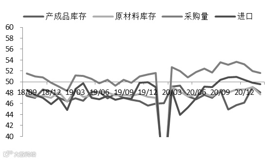 ◇从库存情况来看,2月两大库存指标持续处于荣枯线之下,去库速度加快。产成品库存指数回落1个百分点至48,原材料库存指数回落1.3个百分点至47.7,2月受需求及出口端修复的带动,持续去化。步入一季度消费需求延续修复,预计库存水平将延续去化。