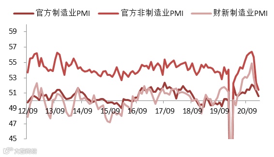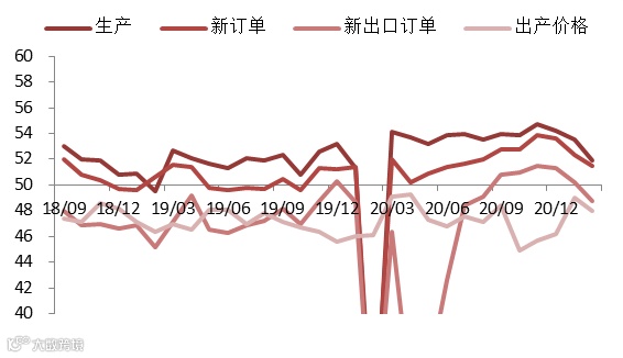 ◇2月官方制造业PMI录得50.6,环比1月回落0.7个百分点,虽仍处于扩张区间,扩张力度季节性放缓。在需求方面,2月新订单PMI分项录得51.5,低于前值0.8个百分点,消费及投资仍持续修复,但改善幅度有所放缓。目前来看,一季度经济或步入加速赶顶阶段,投资保持较高的景气度,消费端持续修复,但修复速率有所放缓。叠加2月春节假期需求提前释放,以及就地过年政策抑制部分消费,国内消费端修复速率放缓。在生产方面,2月生产指数较前值回落1.6个百分点至51.9,生产端景气度仍保持在高位。随着北方进入冬季,赶工期结束,叠加春节假期停工,生产端有所降温。但工人就地过年,将抬高历年同期的开工率,对2月份的工业生产有正面影响。2月新出口订单录得48.8,跌至荣枯线之下。年前海外需求集中释放,在手出口大单消化;海外扩张动能边际放缓,海外需求承压。需持续关注疫苗进展,及美国第三轮刺激政策的进展,能否带动外需回暖,从而支撑出口增速。