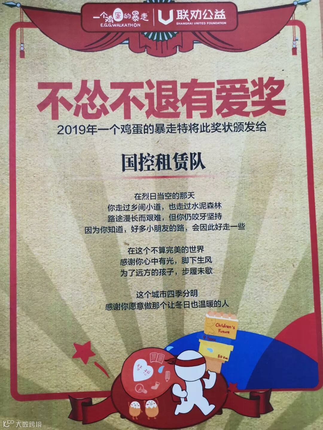 5月18日,2019“一个鸡蛋的暴走”回归日上,国药控股(中国)融资租赁有限公司(下称“国控租赁”)的暴走小队凭借全员完赛的好成绩获得了“不怂不退有爱奖”,为公司首次参与暴走打响头彩!