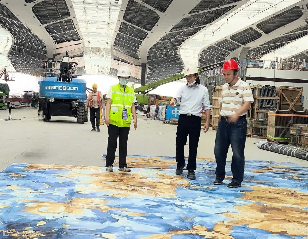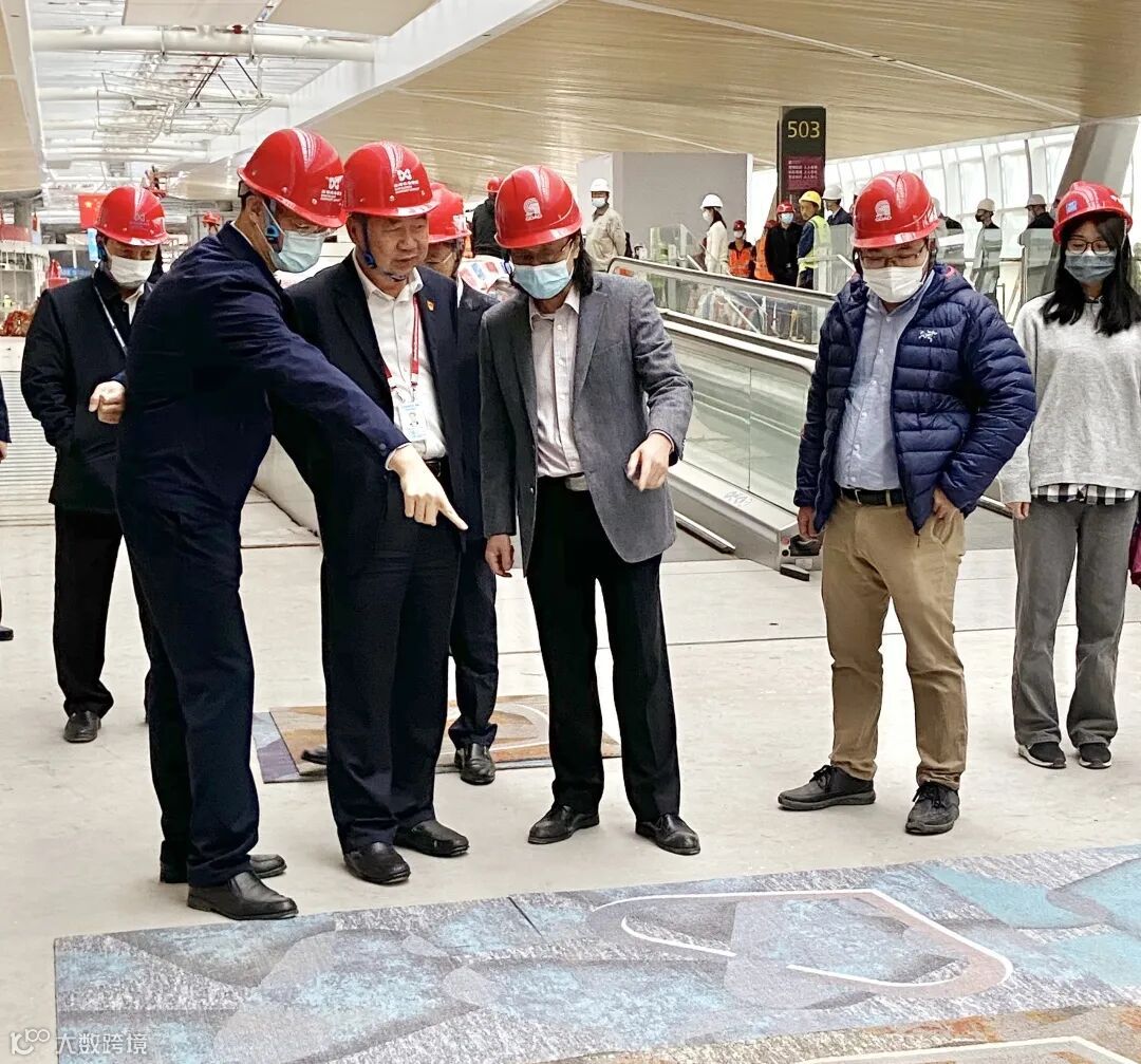 陈雄(右二)在白云机场T3航站楼工地推敲地毯图案