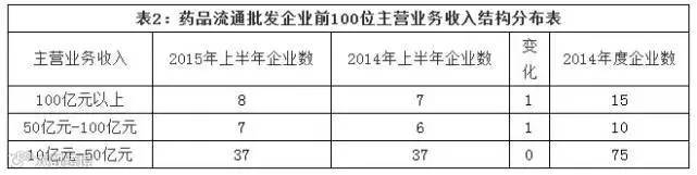 表2:药品流通批发企业前100位主营业务收入结构分布表