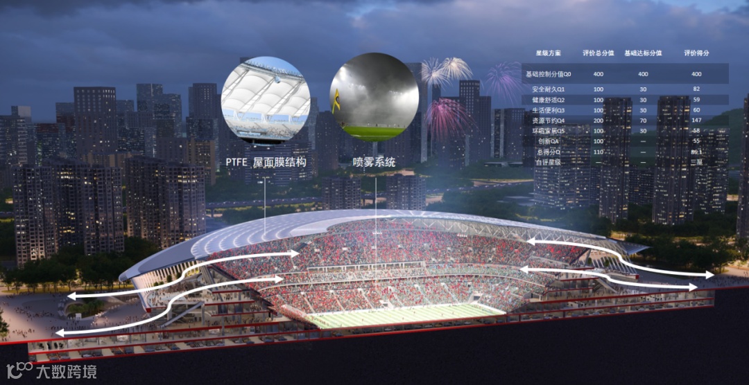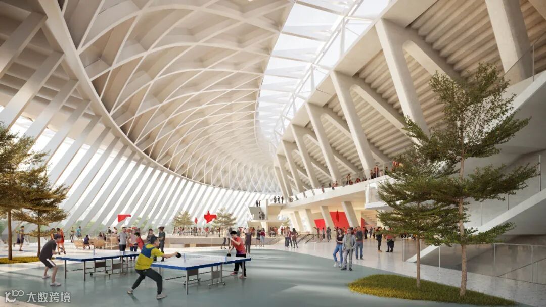 建筑外壳南北通风,东西实体+百叶遮阳,结合膜屋面与阳光板平衡节能与采光。利用无障碍坐席净空需求抬升看台,通风散热,增加绿植,多措并举打造湾区体育建筑生态新标杆。