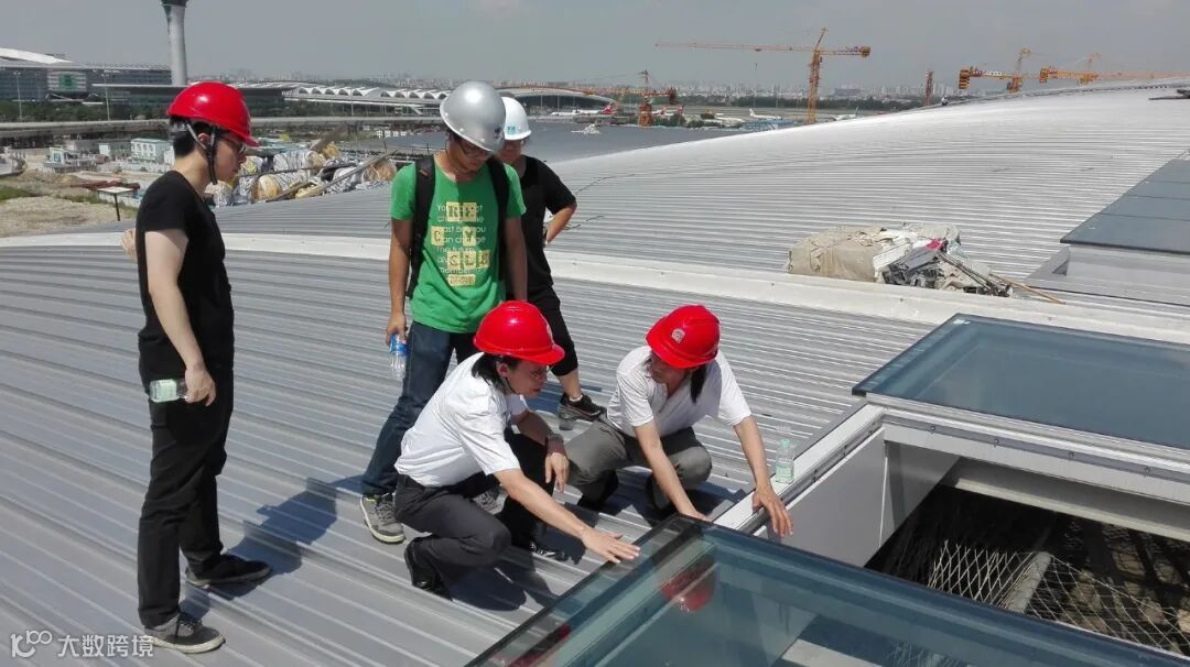 ▲ 陈雄(前蹲右二者)与幕墙专家罗忆(右一)及同事们在T2航站楼屋面