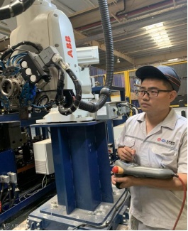 通电成功后,柔性焊接设备搬迁工作进入调试阶段,机器人快换动力头程序编程和点位校准的切换工序对精度要求非常严格,稍有偏差就会影响设备的正常工作,这也是调试工作中较为困难的一个难点。负责调试的设备管理室维修工程师潘伟明在全体设备搬迁小组人员的配合下,运用所学知识和工作中积累的经验,花费整整3天的时间,没日没夜、加班加点工作最终达到切换工序的流畅性和稳定性技术要求,确保了柔性焊接设备搬迁工作的顺利开展。