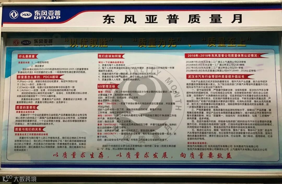 “质量是企业的生命”!东风亚普本着客户至上的宗旨,一直在认真贯彻执行质量落地工作。目视化看板是质量落地工作之一,变化点的警示、记录及对策,使全员全过程进行质量管理,同时通过质量晨会、周会、月度例会、快返会、大数据分析等措施及时应对质量问题,努力实现以产品质量提升促进企业效益的提升。