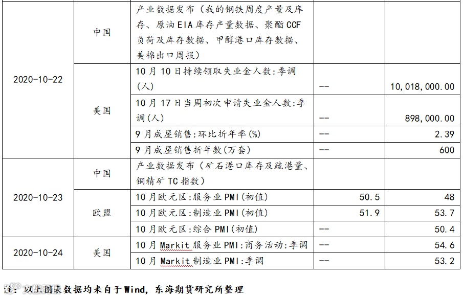 3. 10月22日(周四):产业数据发布(我的钢铁周度产量及库存、原油EIA库存产量数据、聚酯CCF负荷及库存数据、甲醇港口库存数据、美棉出口周报)、美国10月17日当周初次申请失业金人数、美国9月成屋销售
