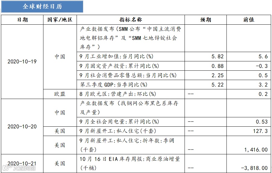 1. 10月19日(周一):产业数据发布(SMM公布“中国主流消费地电解铝库存”及“SMM七地锌锭社会库存”)、中国第三季度GDP及9月主要经济数据