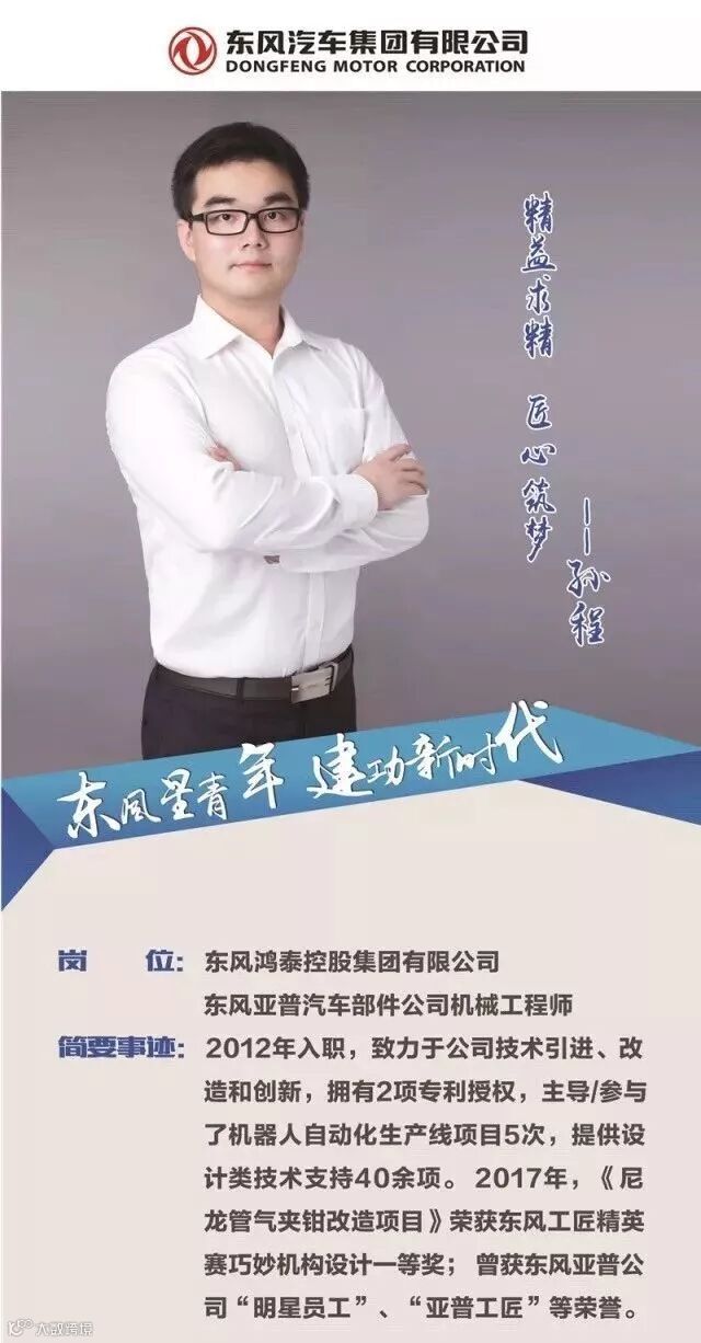 4月27日,在东风公司工会、共青团举办的“庆五一,迎五四”的主题活动中,东风亚普机械工程师孙程被授予“青年明星”称号。