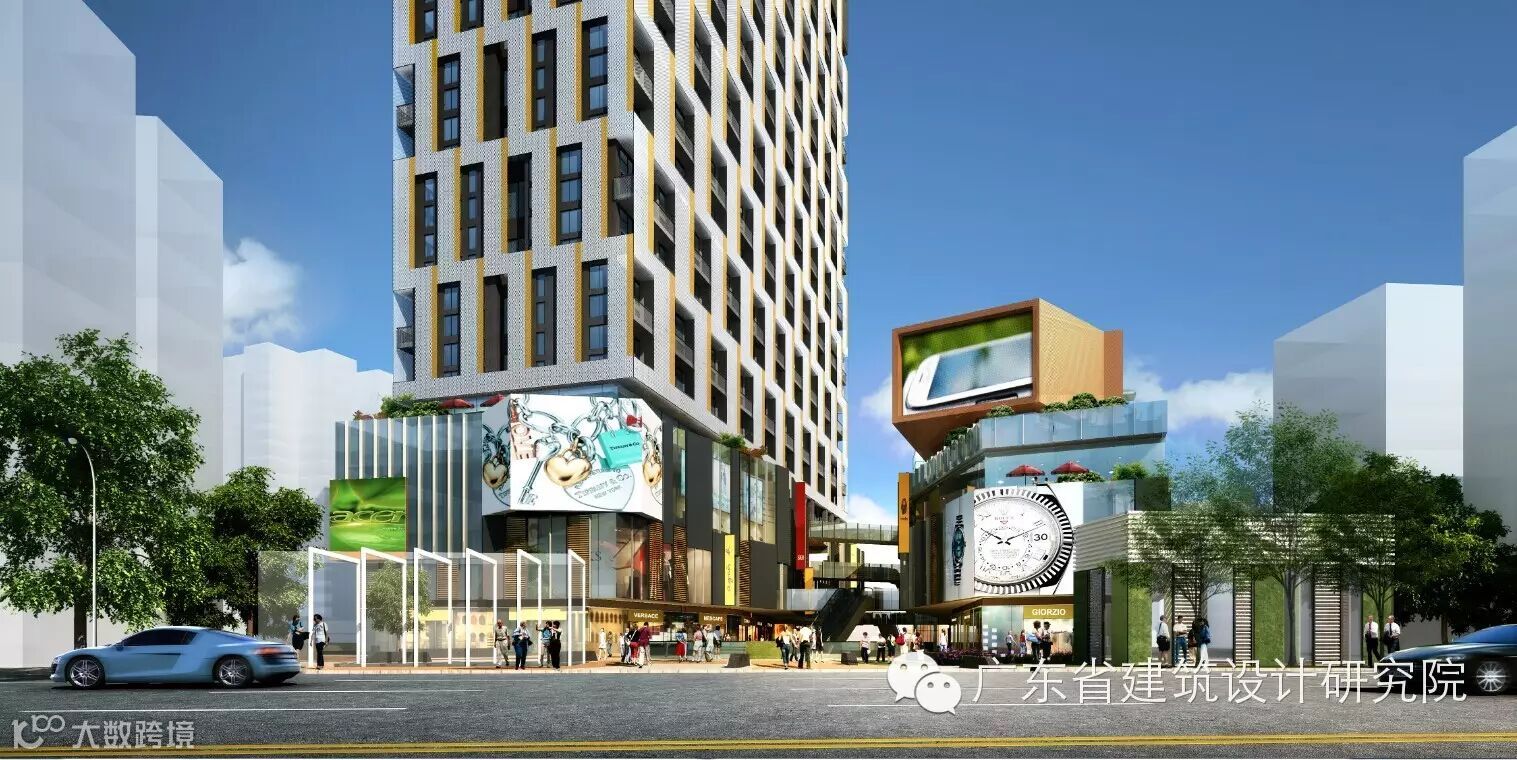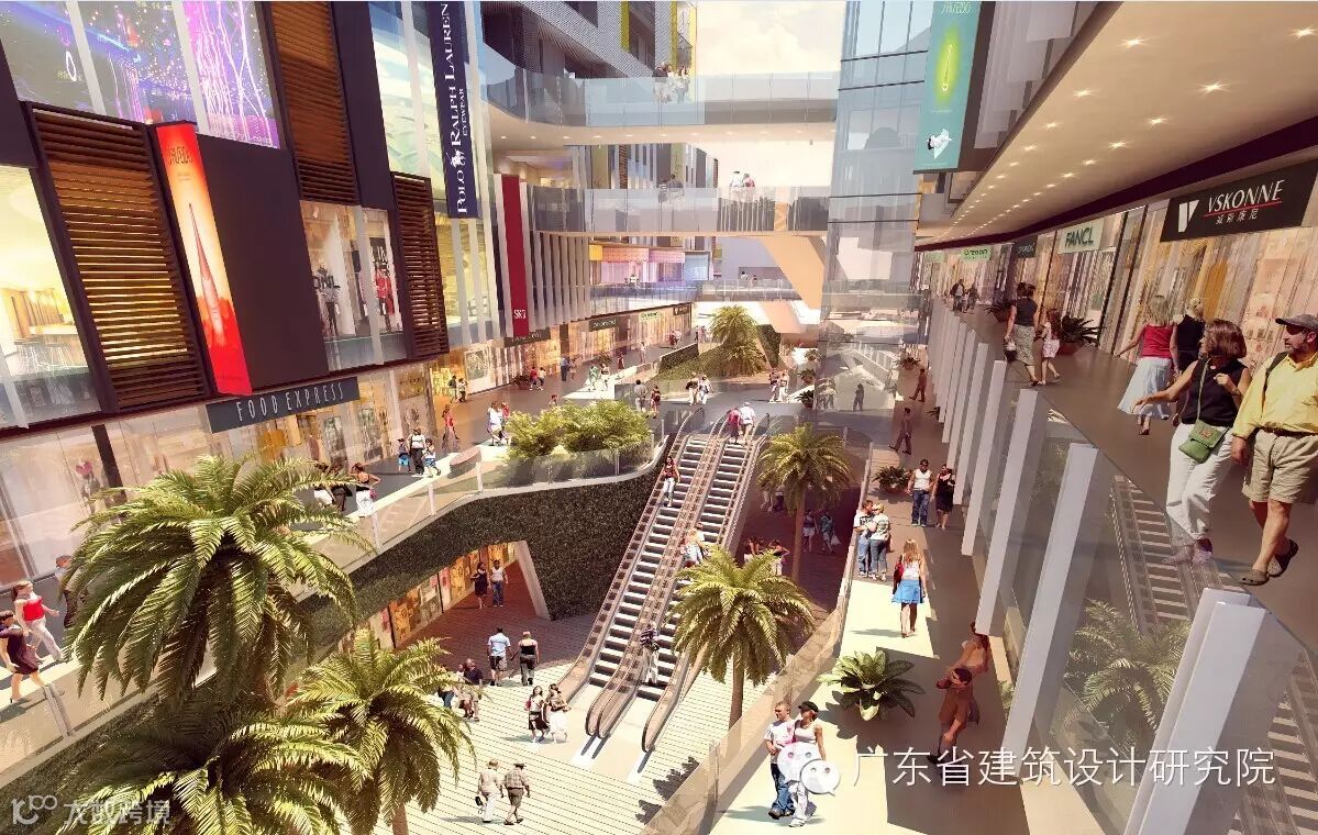 项目利用不同商业连廊与休闲商业平台在步行空间中穿插,划分不同性质和特性的商业分区,从而把地块东西两边人流连接起来。为了配合东西两侧商业的开发,在东西两侧临街用地上设置主力店铺和大型商业广告位,以及裙楼商业带,使两侧的入口形成标志性广场,从而提高用地的商业价值。