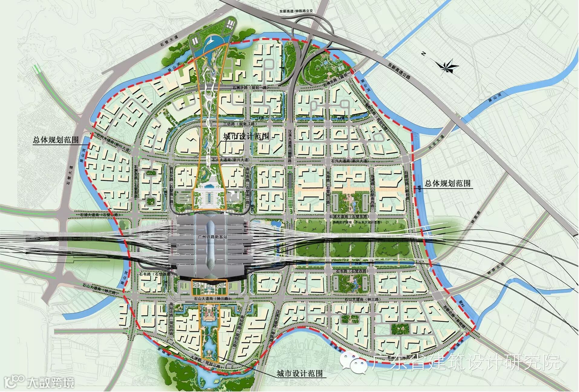 广州铁路新客站是广州铁路枢纽的组成部分,是服务珠三角、面向华南地区的区域交通平台,是衔接珠三角城际轨道交通的客运枢纽,是广州市最为重要的窗口和门户之一。作为其配套市政项目,主要包括广州铁路新客站中轴广场区、街区公园、河涌景观和道路绿化等四个部分,其中中轴广场区除了合理解决交通功能外更肩负着对外展示广州形象的功能。