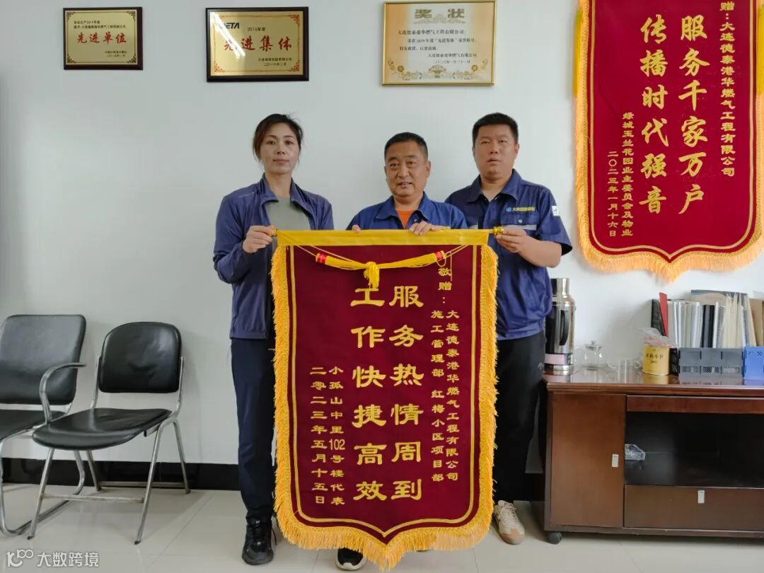 近日,信基V谷配套园项目负责人、小孤山中里业主代表为金普新区市民诉求服务中心及大连德泰港华燃气股份有限公司送去了一封感谢信及写有“优质营商环境‘排头兵’、护航企业发展‘贴心人’”等三面锦旗,对燃气公司一心为民的服务意识和务实高效的工作作风给予高度评价。