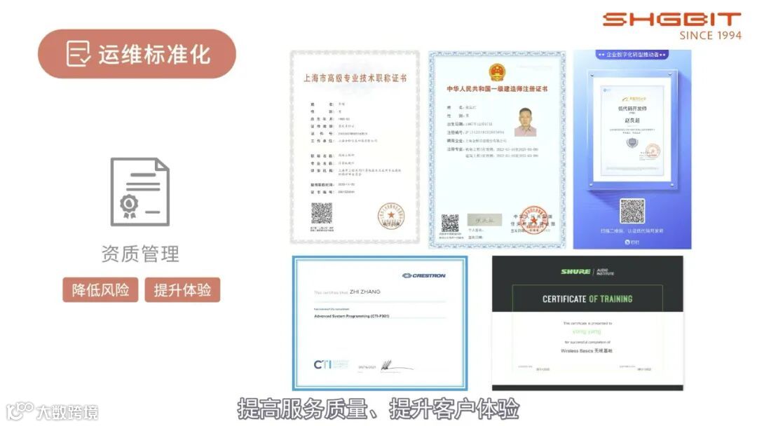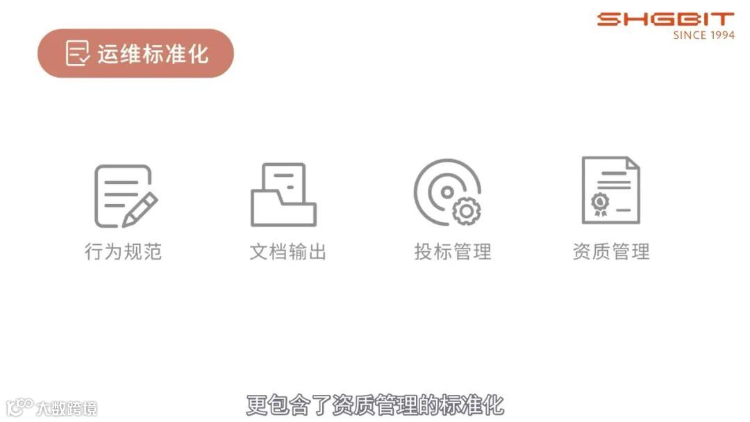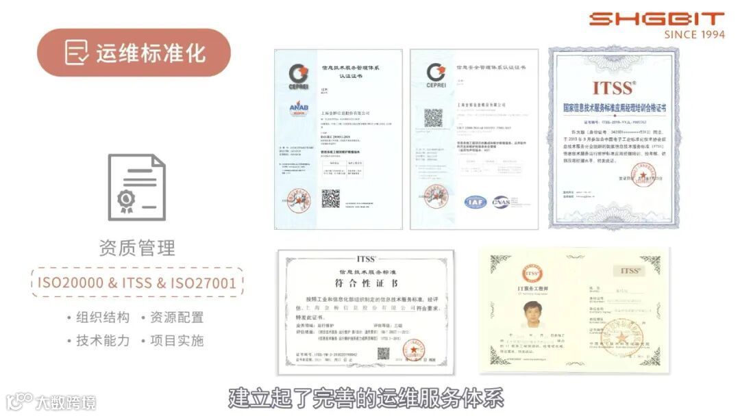 除传统意义上的行为规范、文档输出和投标管理的标准化之外,金桥运维标准化还包含了资质管理的标准化;基于ISO20000和ITSS运行维护标准的模型,从组织结构、资源配置、技术能力、项目实施过程控制等各层面进行整体设计,建立起完善的运维服务体系,更加有效地降低项目风险、提高服务质量、提升客户体验。