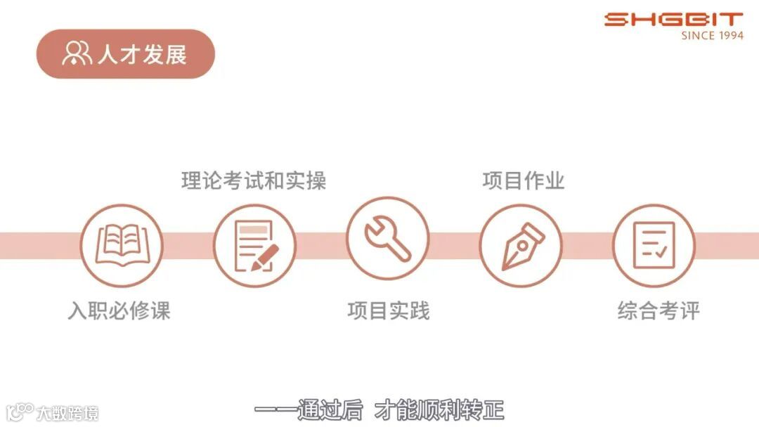 每位新成员都要成功通过"入职必修课、理论考试和实操、项目实践、项目作业、综合考评”这五个阶段的考核才能正式转正。员工可以结合自己未来的职业规划,通过与主管面谈,选择匹配自己的成长路径进行发展。公司也会提供多样化的赋能培训来支撑员工的个人成长。人才盘点,通过岗位职责设定、胜任力模型评估,因材施教、重点培养,能者善任。除此之外,我们还通过全国化的培训基地,持续输出人才。